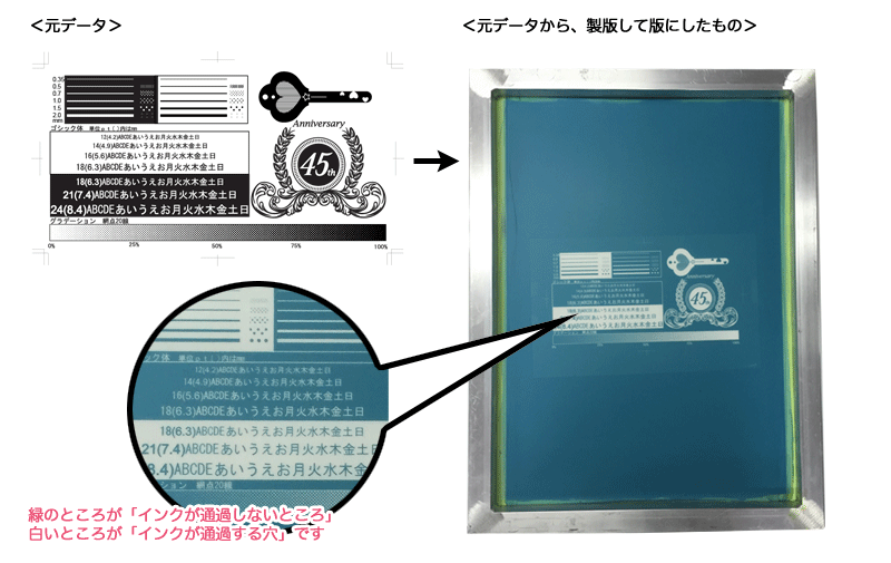 お預かりしたデザインデータを元に、フィルムを作成し、メッシュ生地を使った版を作成します。