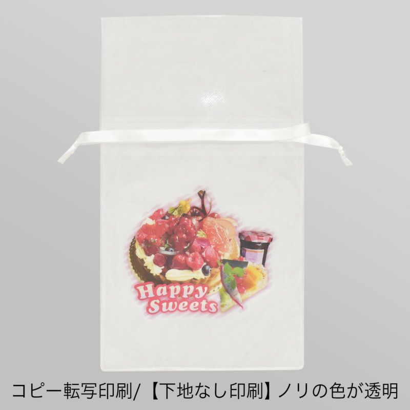 コピー転写印刷(フルカラー):PP不織布に印刷。フルカラー印刷した図案を転写プレスでのせるため、必ずフチが出ます。