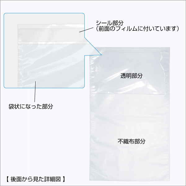 前面はCPP透明フィルム、背面は不織布+CPPの二重構造で、見やすさと通気性を両立。湿気がこもりにくく、商品保護にも優れています。
